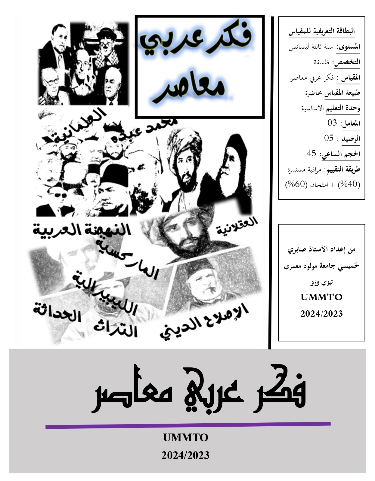 يعد مقياس فكر عربي معاصر من أهم المقاييس التي يدرسها طالب العلوم الاجتماعية والانسانية وخاصة الذي يتخصص في الفلسفة وفرع الفلسفة الاسلامية، حيث أ ّن هذا المقياس يسمح بمطالعة مختلف المشاريع النهضوية التجديدية والفكرية النقدية لأهم مفكري العرب المعاصريين، انطلاقا من بداية حركة النهضة والتجديد إلى غاية الدراسات الآنية، كما أنه يطلع على أهم المفاهيم والآليات والإضافات التي أسهم بها رواد الفكر العربي المعاصر للدفع بحركة الواقع العربي المعاصر نحو التجديد والتطوير، ولعل أهم ميزة يتحلى بها هذا المقياس هو أنه مقياس متنوع المشارب، متنوع الاتجاهات النقدية على حسب كل مفكر، وهذا ما يسمح للطالب بالإلمام بمختلف التوجهات النقدية والفكرية المعاصرة من مشاريع الإصلاح الديني ومشروع المادية والعلمانية والقومية والتطورية، وكما يفهم الأطروحات الاستشكالية للفكر العربي المعاصر وممكناته المنهجية وإشكالاته الفلسفية، لكونه واقع يشهد َحرا ًكا فكرًيا شديدا ومتعّددا، يعتمد في منطلقاته على معطيات المرحلة المتأّزمة من جهة -بما هي واقع مهزوم-؛ وال ّسعي وراء إحداث بديل معرفي نموذجي من جهة أخرى -كمخرج بدائلي للأزمة-، بحيث يكون هذا البديل بعيدا عن الهشاشة التفلسفية - التي قد لا تزيده إلا بعدا عن الفاعلية التاريخية- وقريبا من فلسفة التغيير والبناء، ما وقد تبلور ضمن هذه الحركة التغييرية أطاريح فلسفية متفاعلة مع الواقع وفق رًؤى فكرية متنّوعة،كثيرا يميّزها الاختلاف في اتجاهاتها الفكرية وسياقاتها الموضوعية ومرجعياتها المنهجية (حداثية، إصلاحية، علمانية، تأصيلية...،) مع أن سؤالها كان واحدا يتجلى بالأساس في كيفية تحقيق شروط الانخراط في صناعة الفعل التاريخي، والخروج من غياهب الواقع المأزوم.